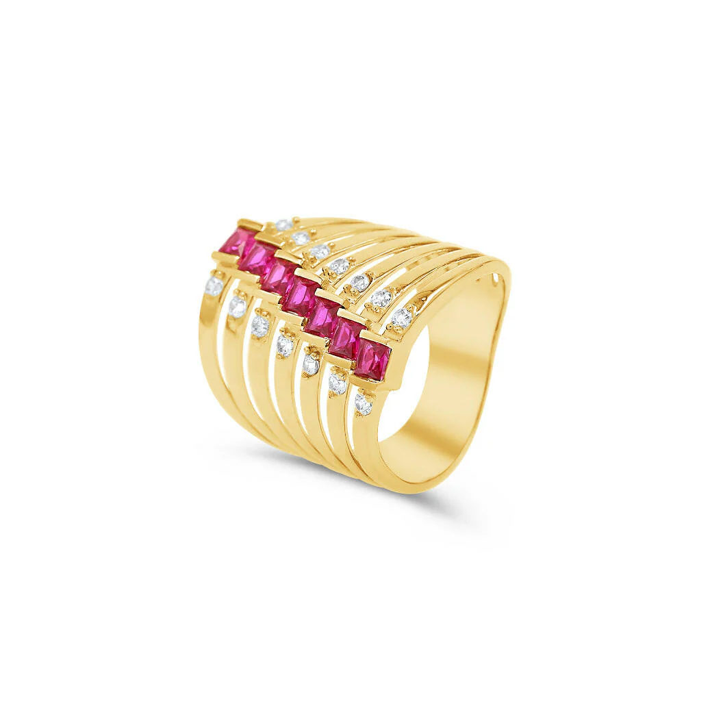 Make a bold entrance with this striking 14K Yellow Gold Cocktail Ring, designed to turn heads. Featuring a unique multi-band layout, this piece showcases alternating rows of high-polish gold and brilliant cubic zirconia stones. Deep pink square-cut stones form a dramatic vertical centerpiece, flanked by sparkling white stones for added brilliance. Crafted in solid 14 karat gold, this ring delivers luxury and edge in equal measure. This ring is perfect for cocktail events, statement styling, or as an unforgettable gift.