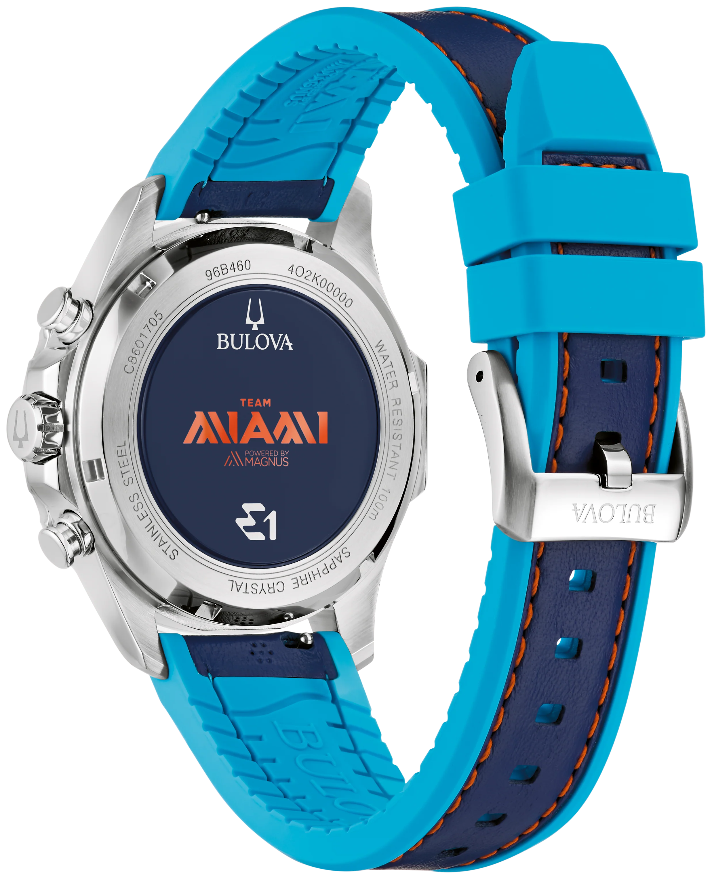 Celebrate innovation and precision with this special edition timepiece from Bulova's Marine Star collection, designed in collaboration with E1 Team Miami. The vibrant blue dial, accented with orange and green highlights, captures the spirit of electric boat racing, making a bold statement on the wrist. Luminous hands and markers ensure readability in various lighting conditions, while the chronograph function allows for precise time measurement. Crafted with a stainless steel case and a durable leather and silicone strap, this watch offers both style and comfort. The anti-reflective sapphire crystal protects the dial, maintaining clarity and resistance to scratches. With water resistance up to 100 meters, it's suitable for various water activities, aligning with the adventurous spirit of the E1 racing team.