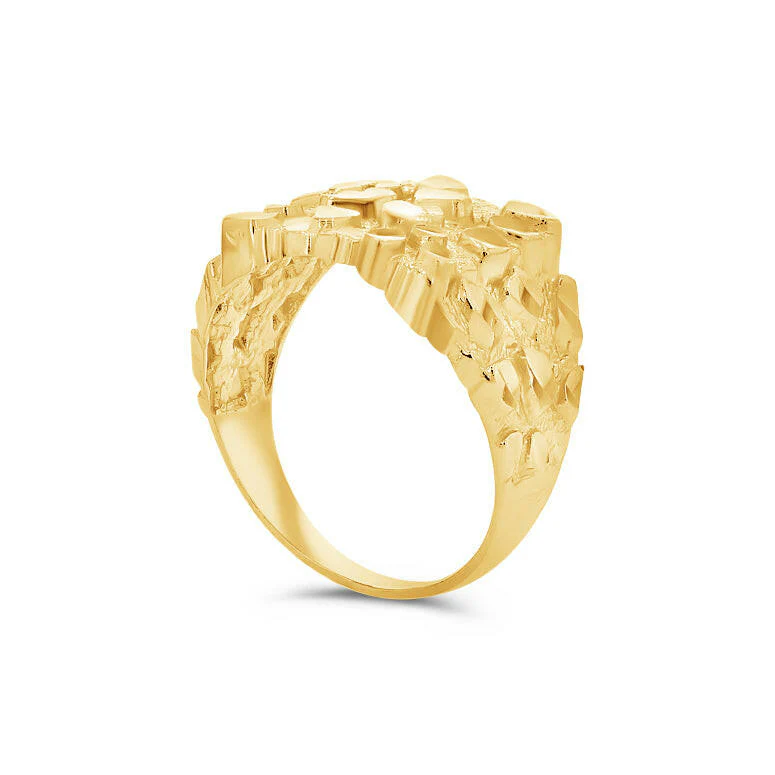 Inspired by natural gold formations, this 10K Yellow Gold Nugget Ring captures the essence of rugged elegance. Its wide band features a mosaic of raised nugget-style textures, offering a dynamic surface that plays beautifully with light. The contrast between the high-polish and matte finishes adds quiet sophistication to a bold design, making it a striking yet wearable piece of jewelry.